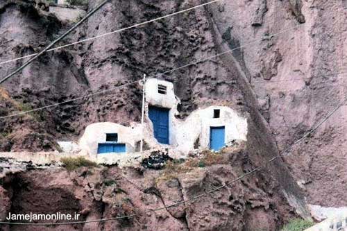 تصوير خانهاي غار مانند در دل كوه در جزيره سانتورين در يونان.